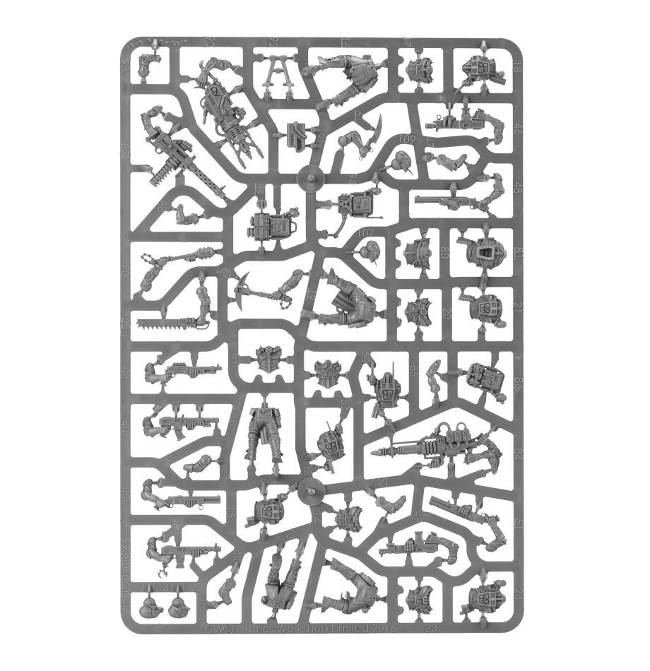 Ce kit plastique contient les composants nécessaires pour assembler 10 Genestealer Cult Neophyte Hybrids, armés de fusils d’assaut, de pistolets mitrailleurs et de charges explosives. Chaque figurine peut échanger son fusil d’assaut par un fusil à pompe – il y en a 10 d’inclus – et 2 figurines peuvent prendre des armes spéciales ou lourdes comme le canon sismique, la mitrailleuse lourde ou le laser minier.